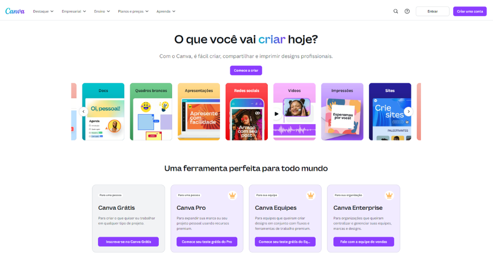 Canva é uma ferramenta gratuita de edição de fotos e design gráfico que funciona diretamente no seu navegador. Ideal para transformar suas imagens em diversos materiais empresariais, como posts para redes sociais, folhetos e apresentações.