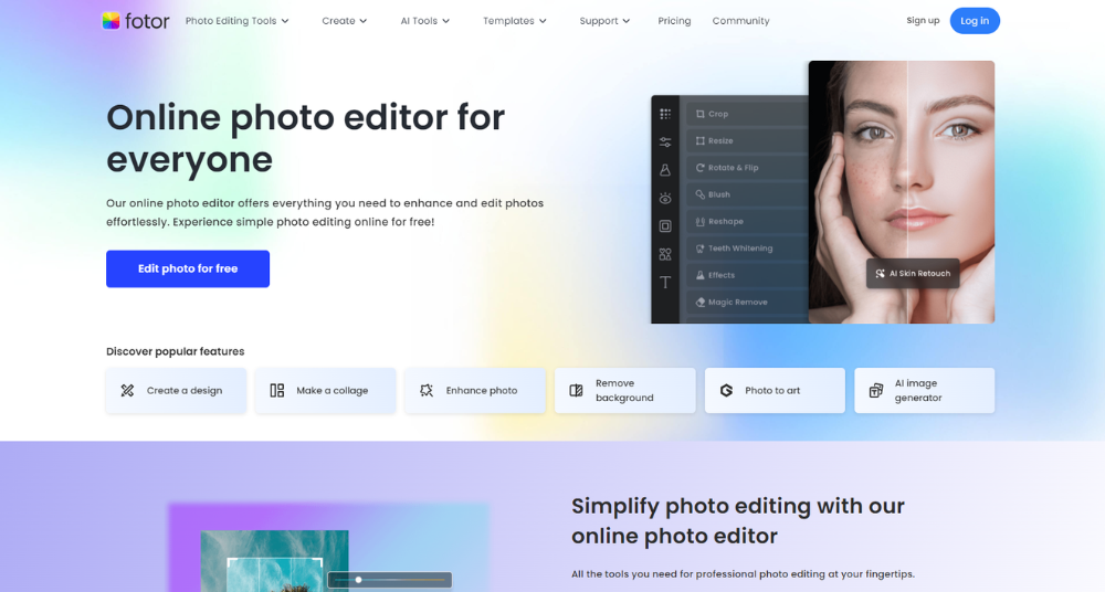 O Fotor torna técnicas avançadas de edição acessíveis para todos, mesmo para quem não tem experiência em design gráfico. Com ele, você pode aplicar filtros, adicionar efeitos e editar imagens de forma simples e prática. Sua interface intuitiva permite a manipulação de fotos com facilidade.